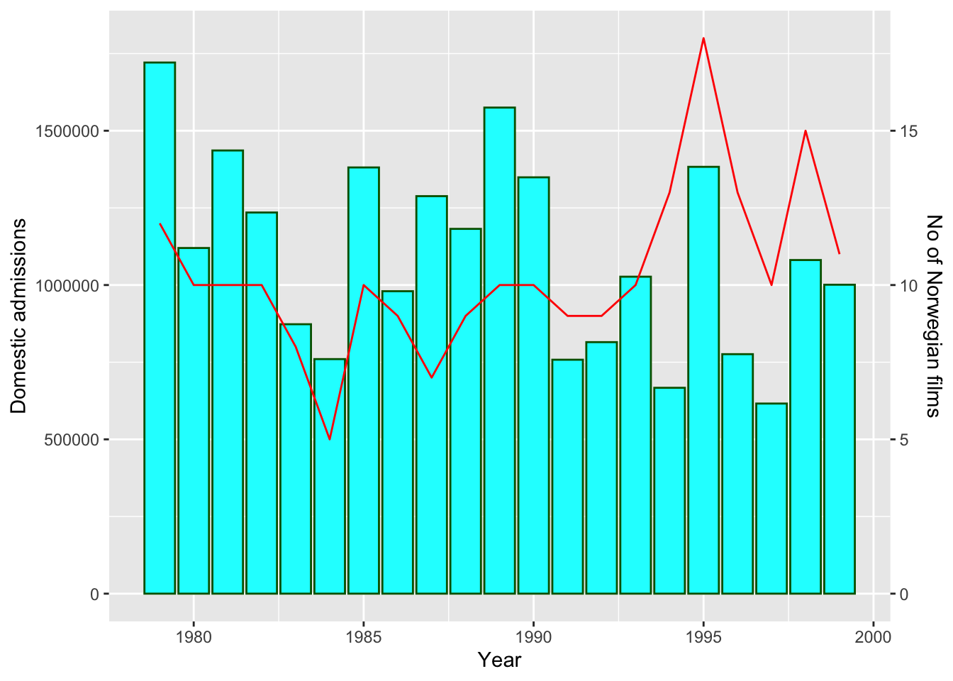There is also little or no correlation between the number of films released and the attendance of any given year. In this period 1979 and 1989 were the best years for Norwegian movies with 1.7M and 1.6M admission from 12 and 10 movies respectively. However, the worst years, 1994 and 1997 saw only 667,000 and 616,000 admissions from 13 and 10 movies. Admissions could also vary wildly from year to year, as high admissions were usually caused by one or two unusually successful movies. In 1995 admissions for Norwegian movies reached almost 1.4M, more than twice the year before - and then fell to 776,000 in 1996.