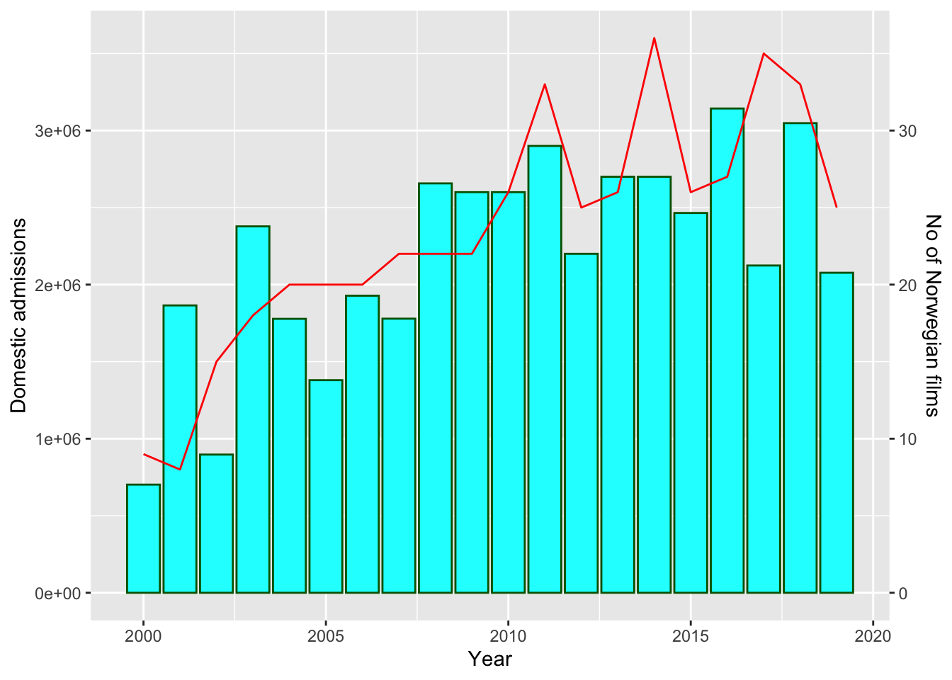 While overproduction does not seem like a viable strategy on a company level, the increase in Norwegian titles since 2000 has brought not only an increase in admissions, but also an increased stability. From 1979 to 1999 the number of films produced was generally low, between five and 18 a year. The total attendance for Norwegian movies was also low, averaging at around 1 million tickets sold.